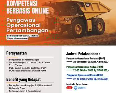 Kami menyediakan diklat dan sertifikasi Pengawas Operasional Madya untuk mengembangkan pengetahuan dan keterampilan Anda di bidang pertambangan.