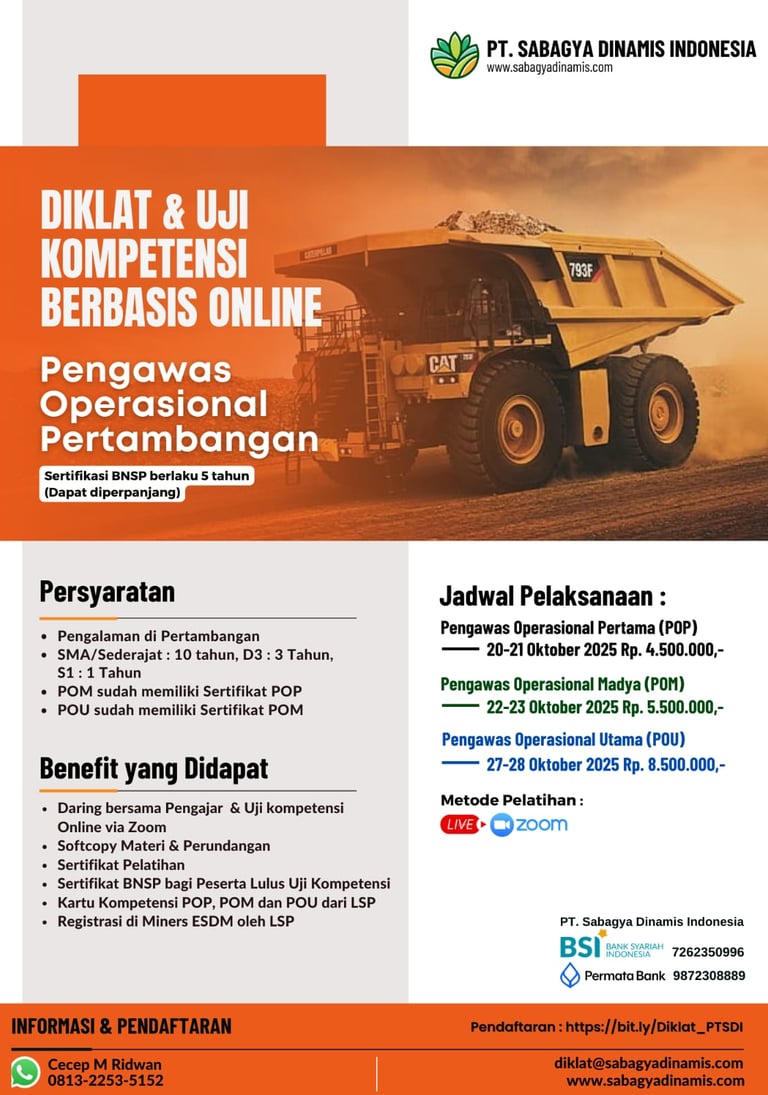 PT. Sabagya Dinamis Indonesia adalah perusahaan yang menyediakan layanan diklat pertambangan dan sertifikasi Pengawas Operasional Pertambangan. Kami juga memiliki layanan di bidang K3 Pertambangan, Reklamasi dan Pasca Tambang